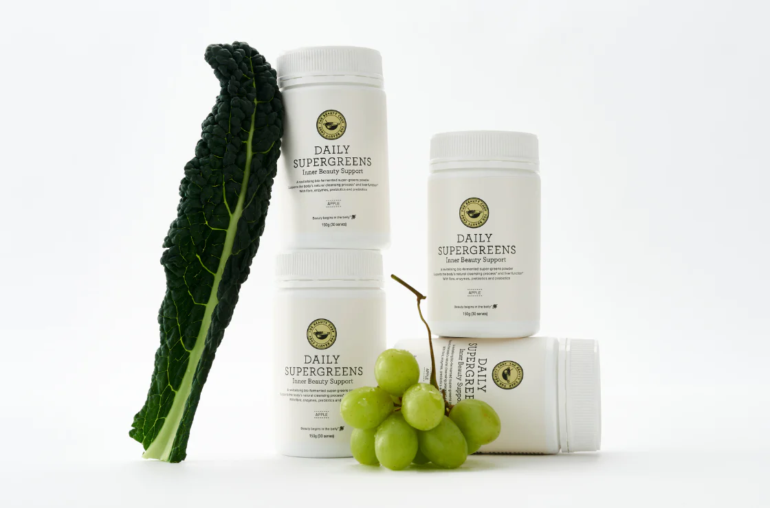 And finally, don’t be afraid to give your gut a helping hand by adding a daily dose of DAILY SUPERGREENS Inner Beauty Support to your routine. This bio-fermented super-greens powder has been specifically formulated to help your body realign and support your natural cleansing processes by promoting a happier, healthier gut. Ingredients such as fibre-rich banana starch and Jerusalem artichoke provide a prebiotic-boost to your microbes, while choline aids liver function and fat metabolism—for even greater detoxification benefits. While this delicious greens powder can be integrated into your existing inner beauty routine—for a more committed cleanse (which is often beneficial after periods of excess or at the start of a new season), download the Cleanse & Reset Program eBook and join the CLEANSE Reset—a 14-day online program.