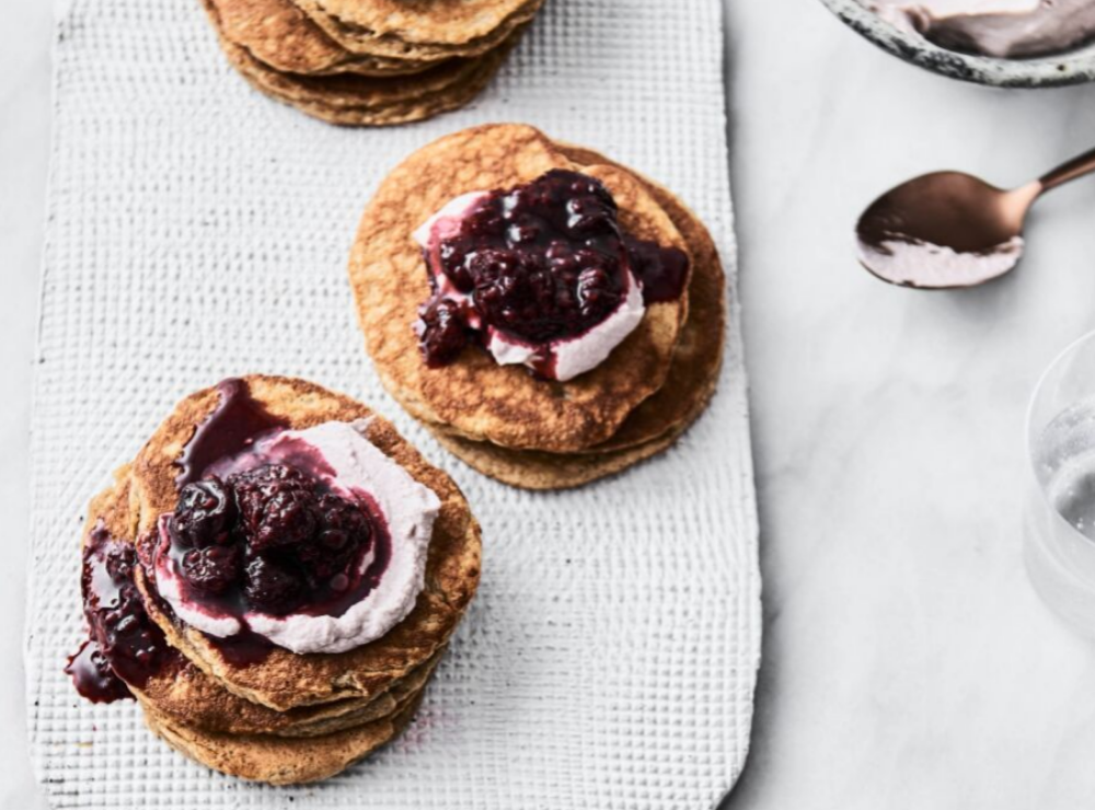 - To serve, stack the pancakes, top with glow yoghurt and berry compote. Scatter with cacao nibs.