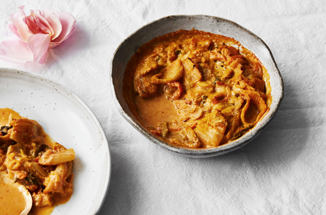 - Arrange the kimchi in two 3.5 cm (1 1/2 in) deep, 375 ml ( 12 1/2 fl oz / 1 1/2 cups) capacity ovenproof baking dishes.
