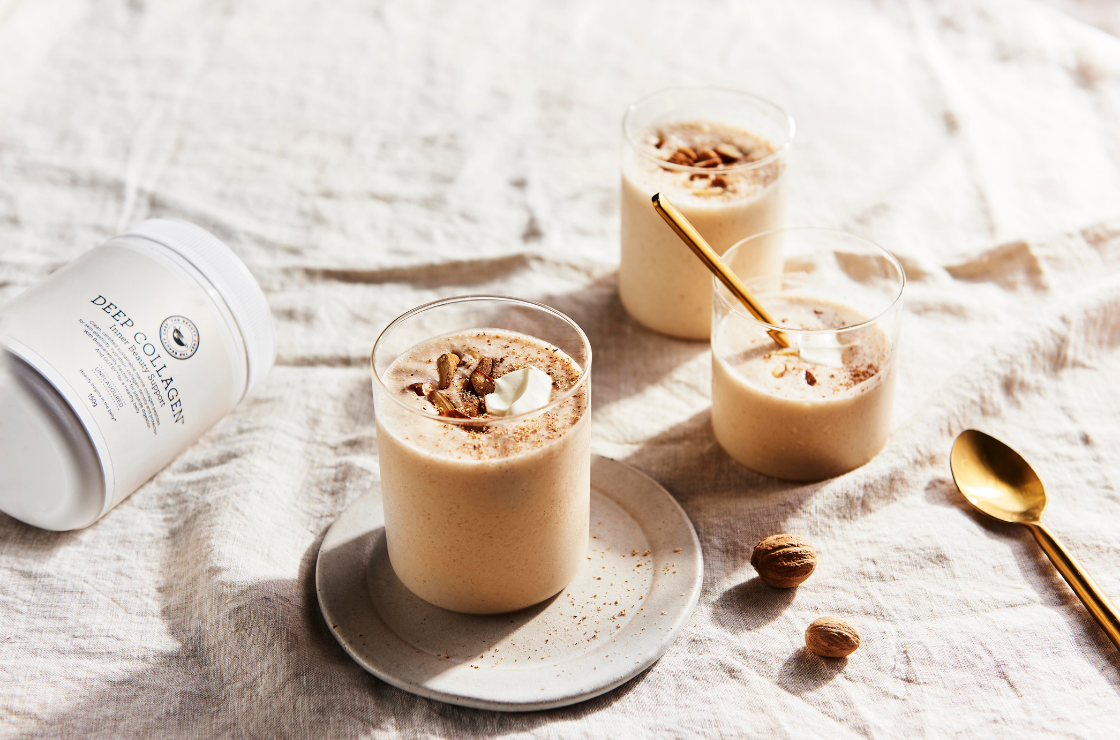 This smoothie recipe is dairy-free, gluten-free and contains all the amino acids required to help boost your body's natural collagen production while also promoting improved skin hydration and elasticity. Grounding spices from cinnamon and nutmeg provide an earthy, warming flavour—and boast the health benefits of helping to curb sugar cravings.