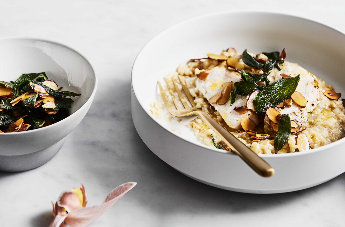 Buckwheat is a great gluten-free alternative for sensitive stomachs. It's also a very good source of manganese, a mineral that is key for the production of a range of digestive enzymes. Soaking your groats for 2 to 6 hours is important to break down phytic acid, making this seed more digestible and even gentler on the gut. I’ve boosted this dish with vitamin E–rich almonds and woody sage, a powerful anti-inflammatory agent shown to ease the symptoms associated with poor digestion.