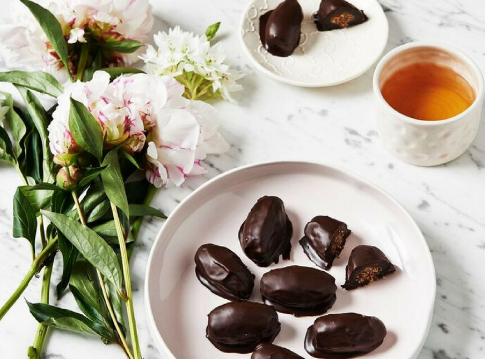 - Holding the stu ed dates on a fork, or using toothpicks, dip and roll the dates one at a time in the chocolate, to coat evenly. Place back on the lined tray..
