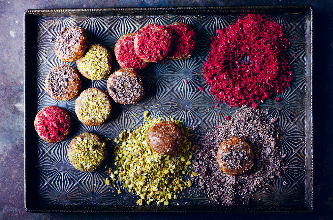 - Place on the tray, and press the tops into pistachios, freeze-dried raspberries or cacao nibs and refrigerate for 1 hour or until firm.