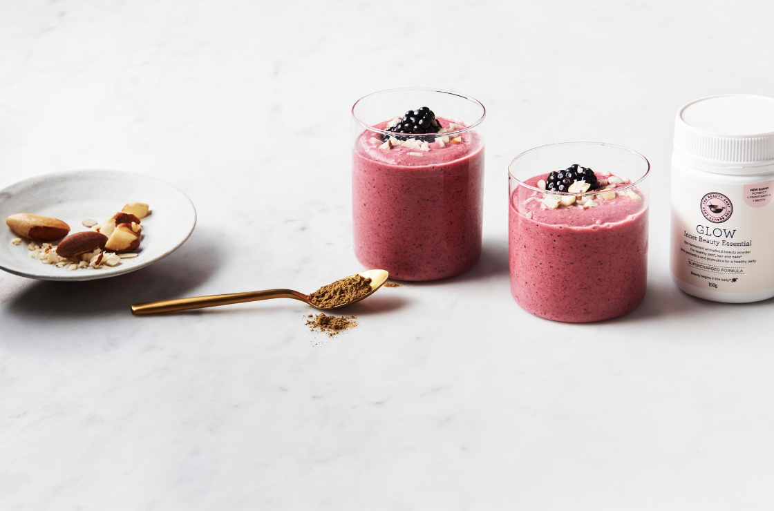Combining healthy fats, gut-nourishing fibre and clean, plant-based proteins, this smoothie is equal parts delicious and nutritious. With the goodness of antioxidant-rich fruits and our very own GLOW Inner Beauty Essential—which contains bio-fermented probiotic wholefoods to support healthy skin, hair and nails—this is one recipe you’ll want to add to your repertoire.