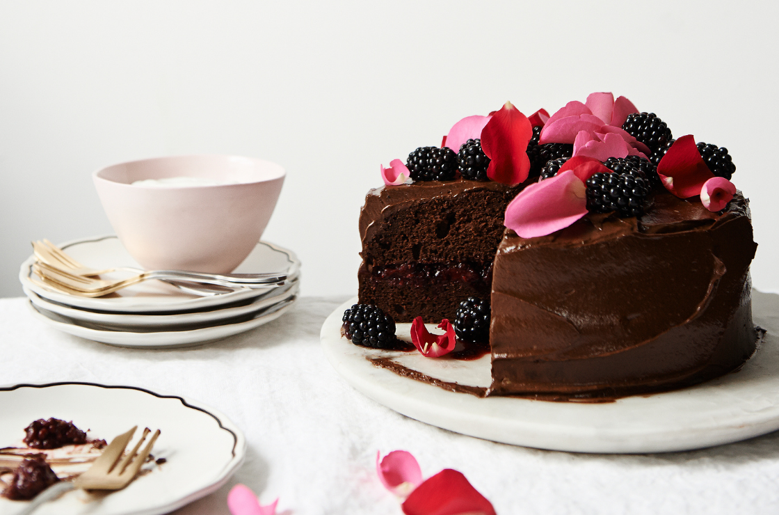 - Using a spatula, spread the frosting on top and over the cake, to completely cover. Decorate with edible flowers and fresh blackberries, if desired.
