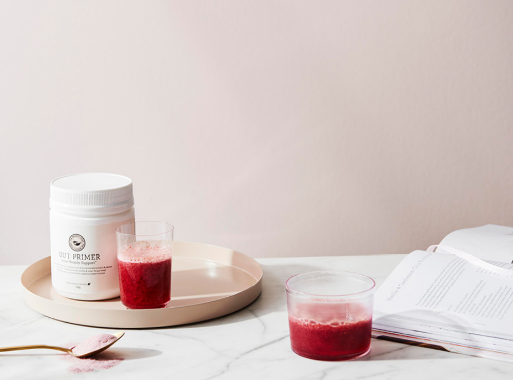 Nourish your belly with this delicious digestive tonic! Designed to help soothe and calm digestion, it contains our restorative GUT PRIMER™ Inner Beauty Support™ powder, as well as fresh ginger and antioxidant-rich raspberries.