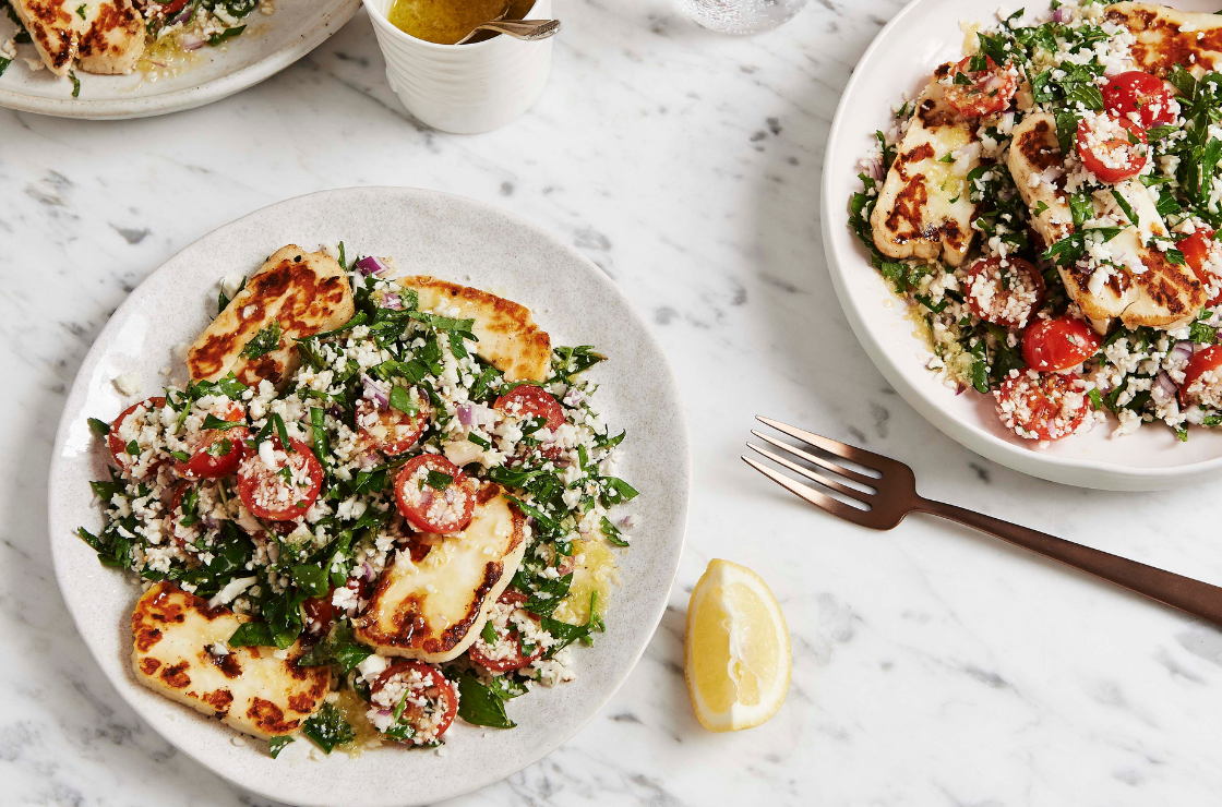 - Serve the haloumi warm with the cauliflower tabouli.