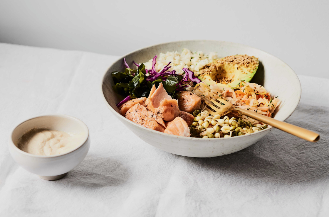 Boasting an abundance of omega-3 fatty acids, this salmon lunch bowl is the perfect dish to add to your repertoire—especially if tuna and rice has become a weekday staple. Paired with sauerkraut and avocado for a serving of fermented goodness and fatty acids, this tasty combo will leave you feeling satiated all afternoon.