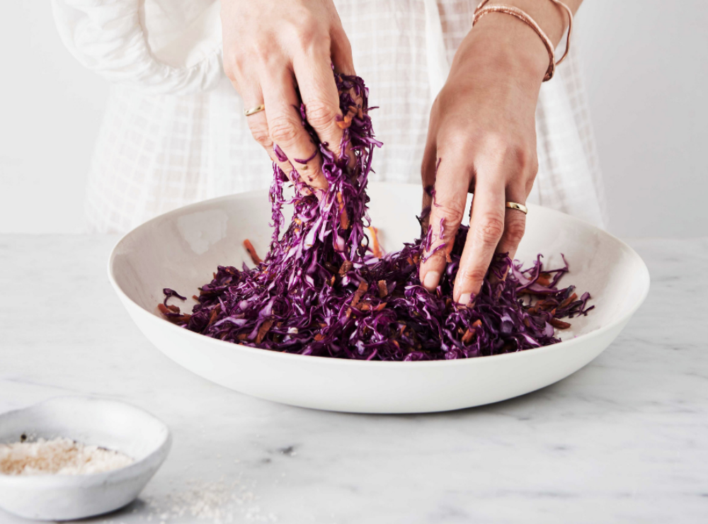 - Add the salt and massage into cabbage for 2–3 minutes to release its liquid and to soften. The salt will combine with that liquid to make a brine. Add the carrots, dill, caraway seeds and berries and toss to combine.