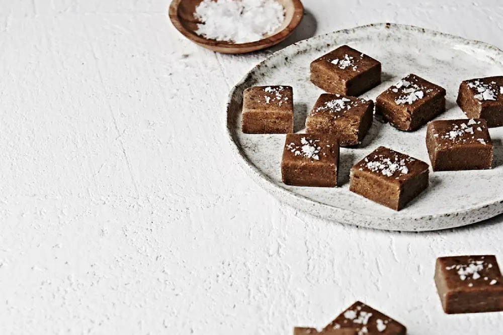 - Place all of the ingredients, except the sea salt flakes, in a high-speed blender. Blend until smooth, thick fudge like consistency.
