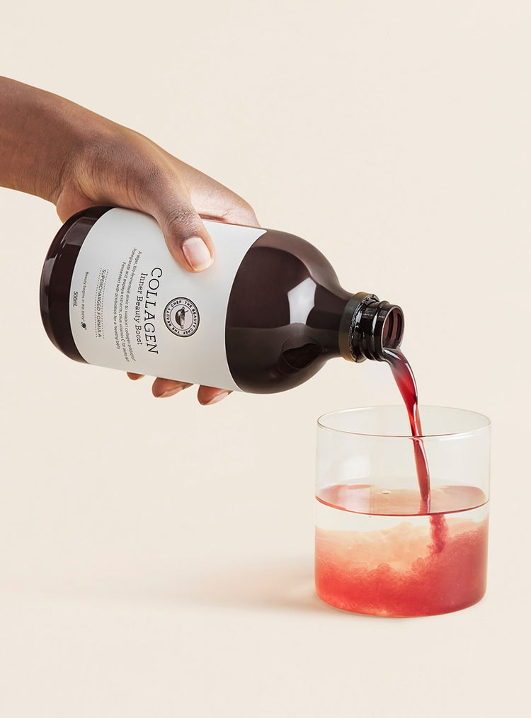 COLLAGEN Inner Beauty Boost: A vegan elixir to plump the skin from within and nourish your gut.* Still with bio-fermented papaya and grapeseed extracts, now with added pomegranate peel extract, gotu kola, organic goji, acai and maqui berries, plus more vitamin C to support collagen production and zinc to support skin structure and healthy hair and nails.*