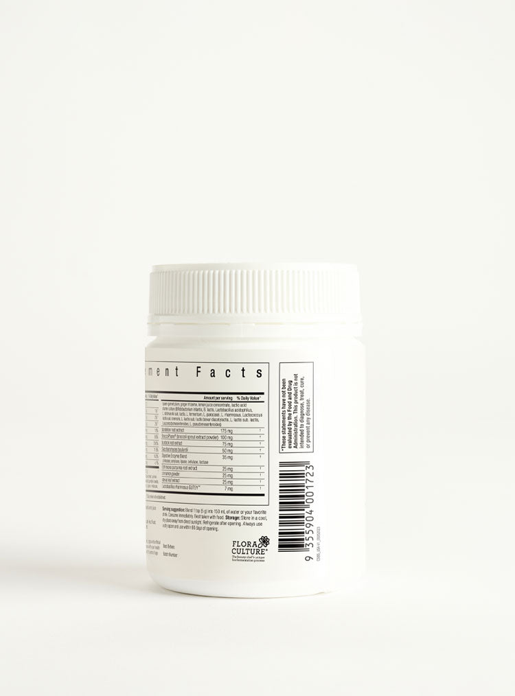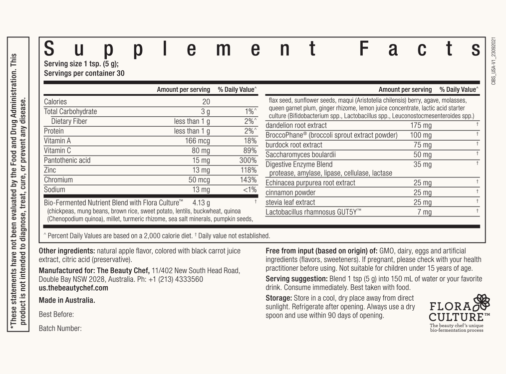 Bio-Fermented Nutrient Blend with Flora Culture™ [(chickpeas*, mung beans*, brown rice*, sweet potato*, lentils*, buckwheat*, quinoa*, millet*, sea minerals, pepitas*, linseeds*, sunflower seeds*, agave*, molasses*, queen garnet plum, ginger rhizome*, lemon juice concentrate, lactic acid starter culture (Bifidobacterium infantis, B. lactis, Lactobacillus acidophilus, L. delbreuckii sub. lactis, L. fermentum, L. paracasei, L. rhamnosus, Lactococcus lactis sub. cremoris, L. lactis sub. lactis biovar diacetylactis, L. lactis sub. lactis, Leuconostoc mesenteroides, L. pseudomesenteroides)), natural colours: turmeric rhizome*, anthocyanins (from black carrot), maqui berry*], dandelion root powder, natural apple flavour, broccoli sprout extract (Broccophane®), mineral: zinc ascorbate, burdock root powder, natural colour: anthocyanins (from red-purple carrot), vitamin: calcium ascorbate, live cultures: Saccharomyces boulardii and Lactobacillus rhamnosus GUT5Y™, digestive enzyme blend (protease, amylase, lipase, cellulase, lactase), vitamin: natural beta carotene, echinacea root powder, cinnamon bark*, sweetener: steviol glycosides, acidity regulator: citric acid, vitamin: calcium pantothenate, antioxidant: ascorbic acid, mineral: chromium picolinate. *organic ingredients