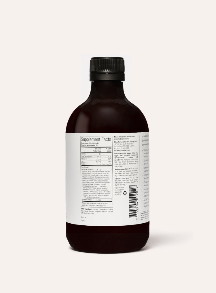 A vegan elixir to plump the skin from within and nourish your gut.* Still with bio-fermented papaya and grapeseed extracts, now with added pomegranate peel extract, gotu kola, organic goji, acai and maqui berries, plus vitamin C to support collagen production and zinc to support skin structure and healthy hair and nails.*