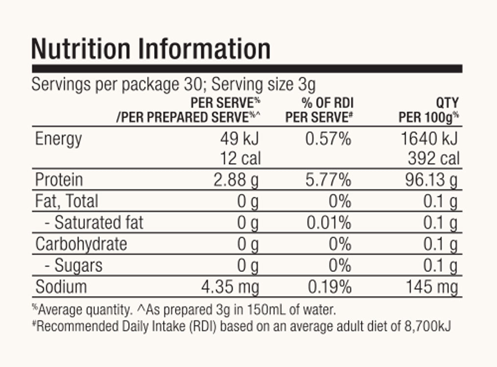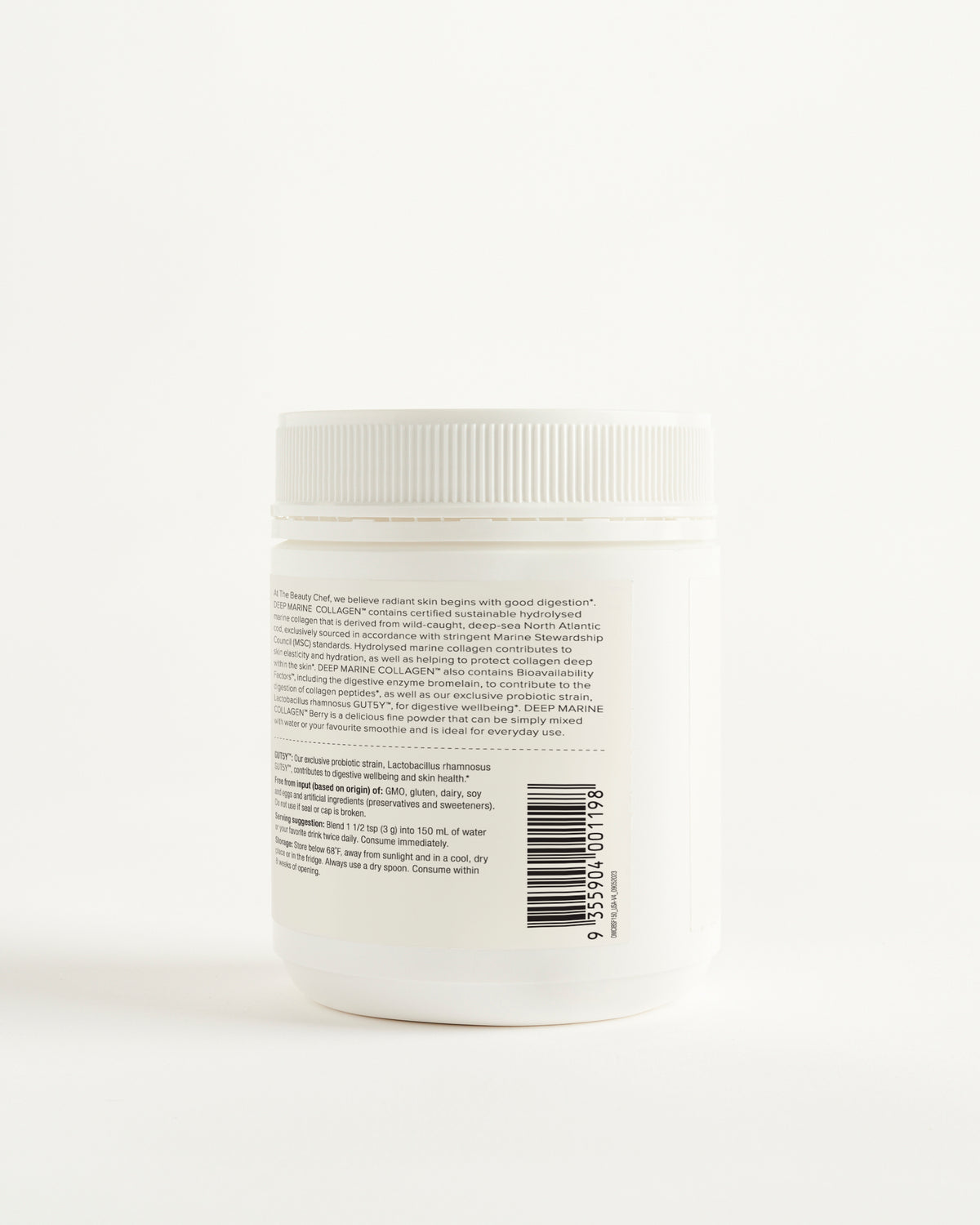 Berry: MSC-certified sustainable marine collagen (97%), natural wild berry flavour, bromelain derived from pineapple (0.6%), Australian mixed berry powder (blueberry, raspberry, strawberry) (0.5%), natural sweetener: steviol glycosides, Lactobacillus rhamnosus GUT5Y™ (0.02%).