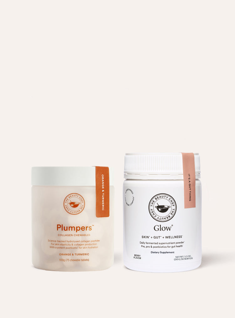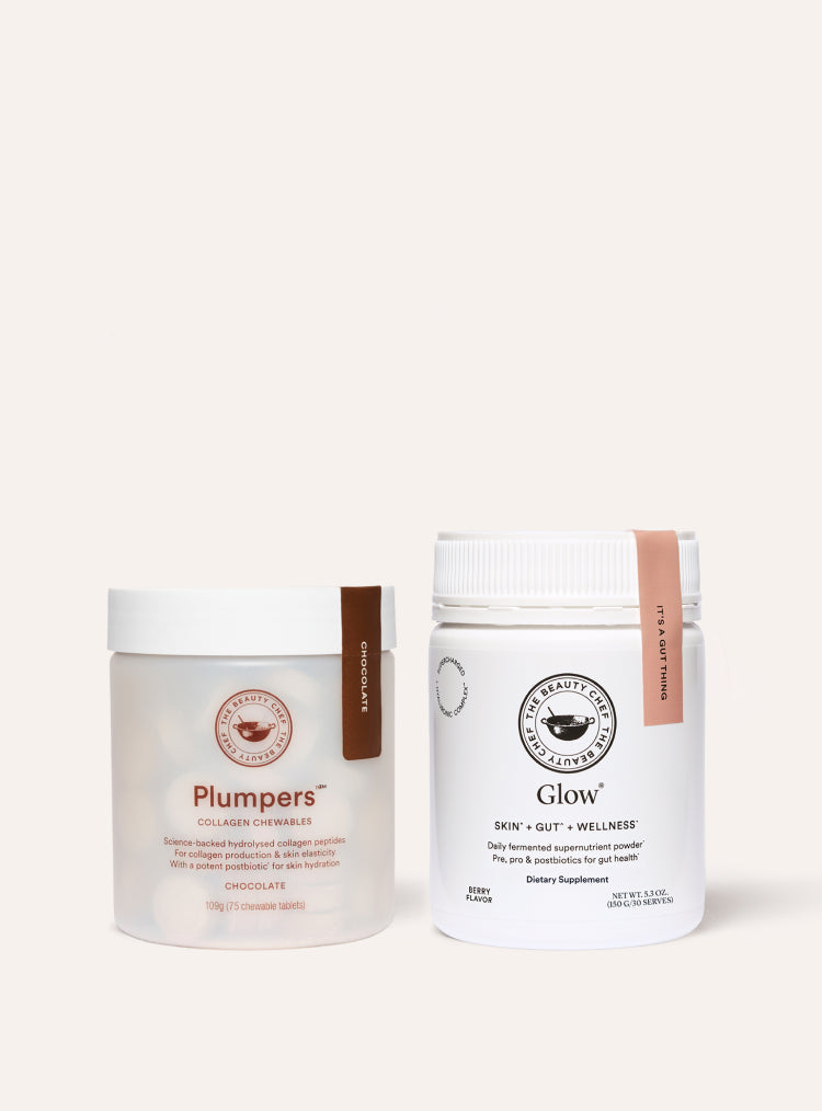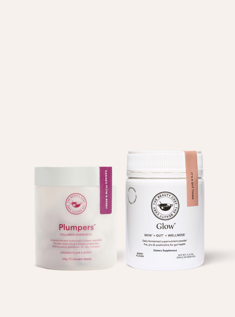 Plump up your glow by pairing our 5-star fermented superpowder with our flavor-bursting collagen chewables.