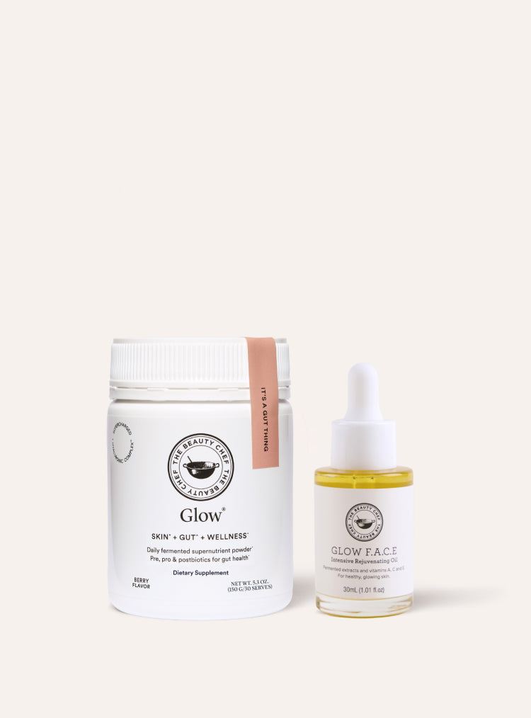 The ultimate glowing duo for inner and outer beauty—this hardworking pair works synergistically to improve gut health and promote more luminous skin inside and out by balancing your belly and strengthening your skin’s natural defences, improving tone, texture and reducing the appearance of fine lines and wrinkles.