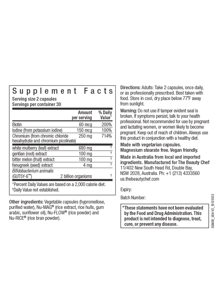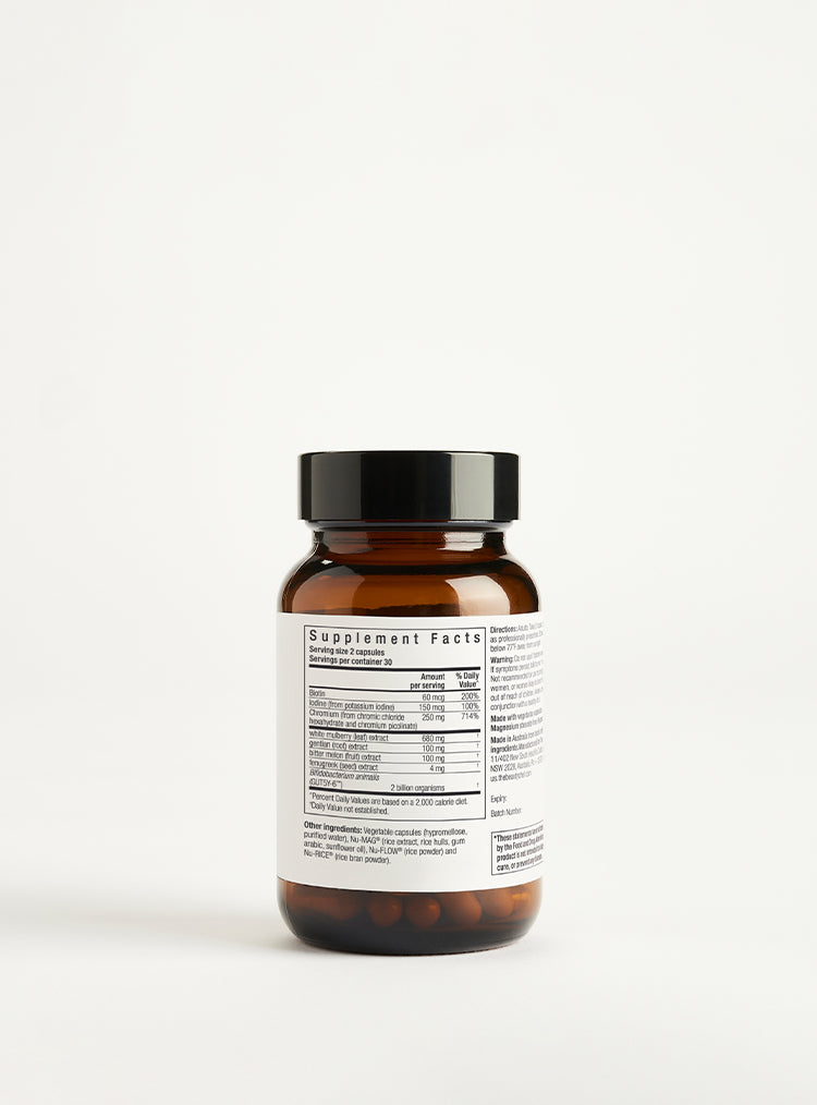 Each capsule contains: Gentiana lutea (gentian) ext. dry conc. 50mg derived from dry root 1g, Momordica charantia (bitter melon) ext. dry conc. 50mg derived from dry fruit 1.5g, Trigonella foenum-graecum (fenugreek) ext. dry conc. 2mg derived from dry seed 250mg, Morus alba (white mulberry) ext. dry conc. 340mg derived from dry leaf 3.4g, chromium 100 micrograms (from chromic chloride hexahydrate 512.8 micrograms), chromium 25 micrograms (from chromium picolinate 201.1 micrograms) (Total chromium 125 micrograms), iodine 75 micrograms (from potassium iodide 98.1 micrograms), biotin 30 micrograms, Bifidobacterium animalis ssp lactis (GUT5Y-6™) 1 billion organisms.