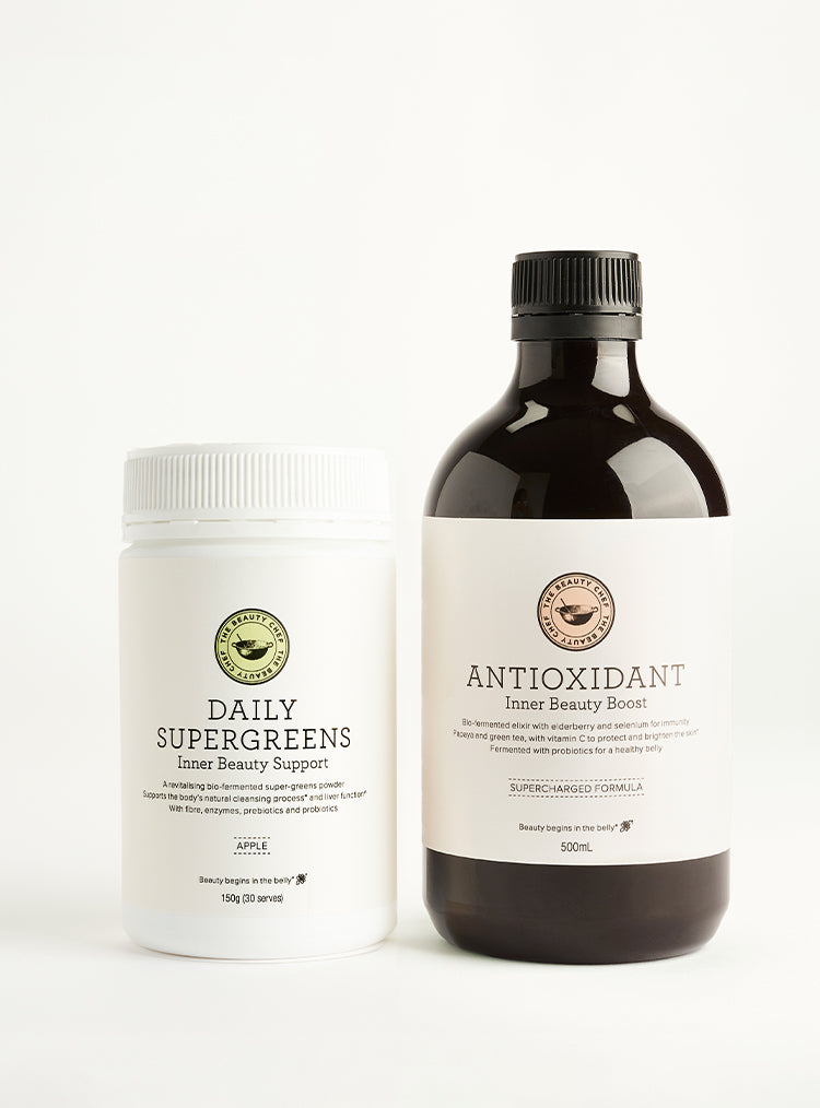 DAILY SUPERGREENS Inner Beauty Support: A bio-fermented super-greens powder to help the body realign and support your natural cleansing processes*. With fibre from banana starch and Jerusalem artichoke, choline to aid liver function and fat metabolism*, plus enzymes, prebiotics and probiotics for a healthy belly.*