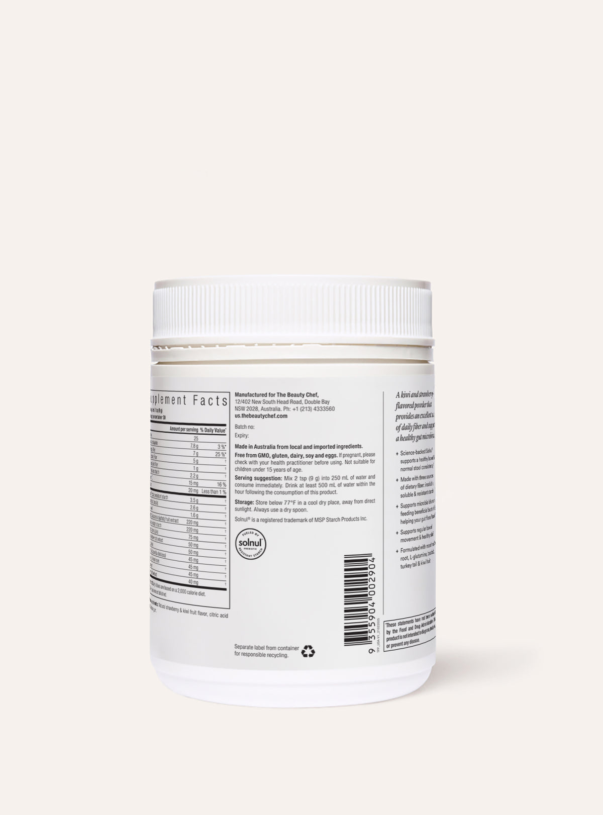 Solnul® potato resistant starch (39%), acacia fibre (29%), pea fibre* (17.8%), natural flavours (natural kiwi, natural strawberry),